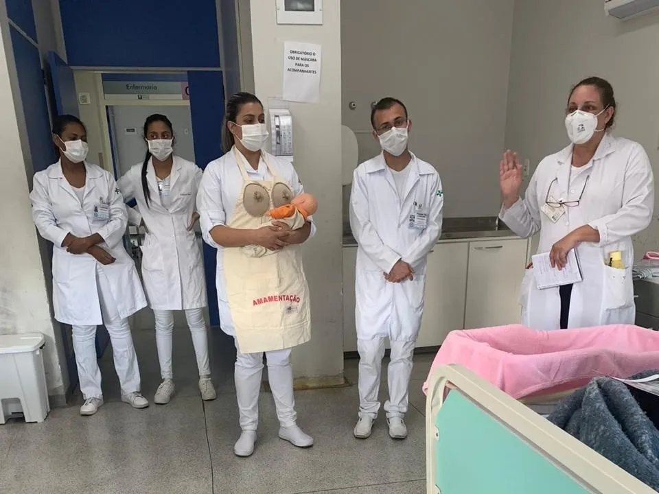 Outra ação foram as orientações durante o estágio de Saúde da Mulher-maternidade I, os discentes deram palestras e demonstraram com bonecos o aleitamento materno, cuidados com o recém–nascido, puérperas e o que fazer na situação em que o bebê engasga.