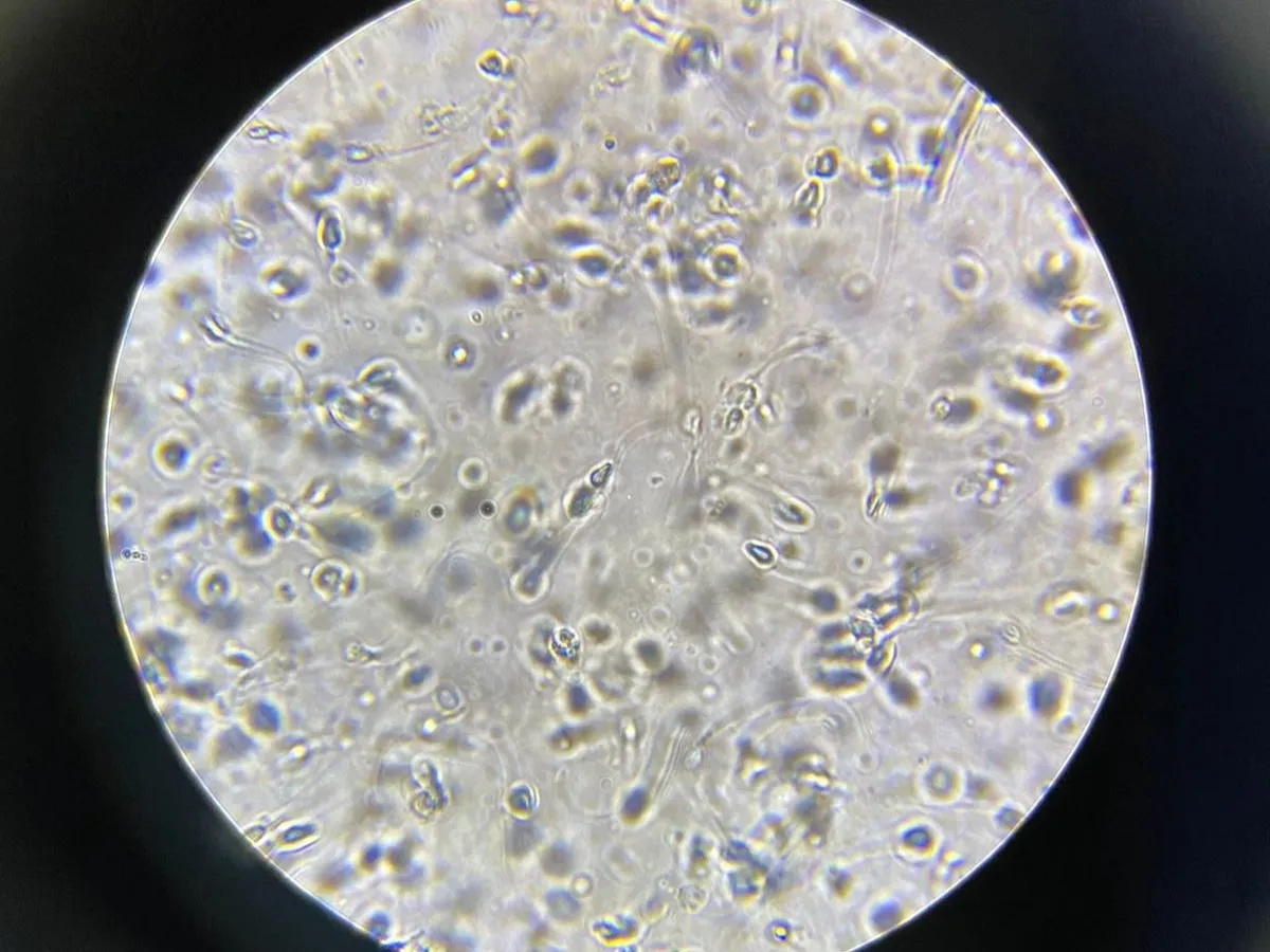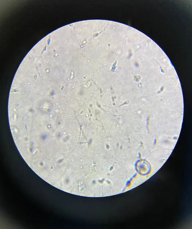 Visão mais aproximada dos espermatozoides no microscópio