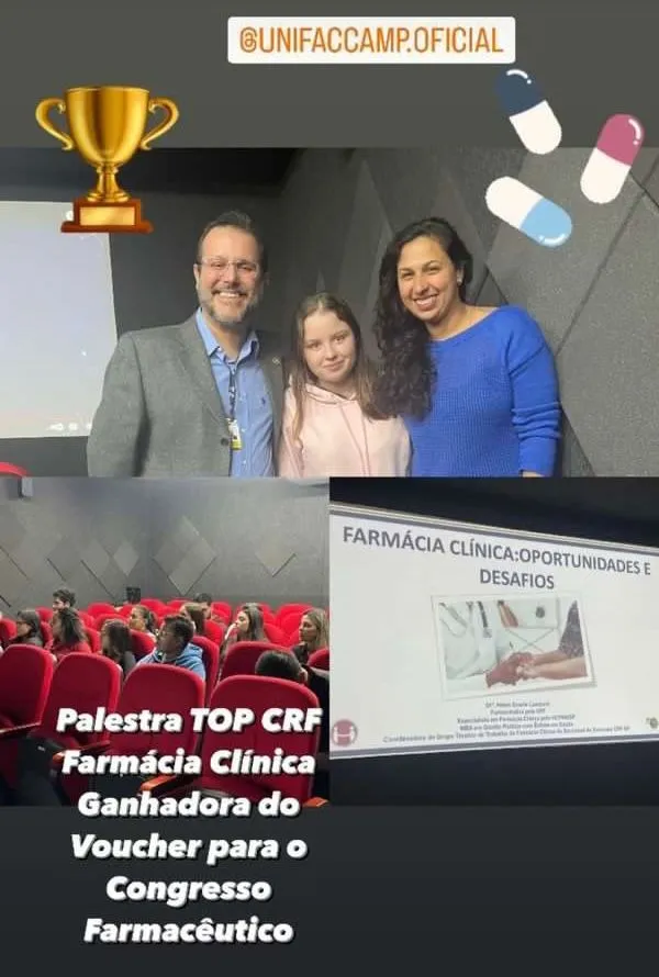 O curso de Farmácia do Centro Universitário Campo Limpo Paulista (Unifaccamp) recebeu o Conselho Regional de Farmácia (CRF/SP) para a palestra “Farmácia Clínica: Oportunidades e Desafios”, no dia 23 de maio. A professora e Coordenadora do curso Dra. Sabrina A. Marques acompanhou o evento.
