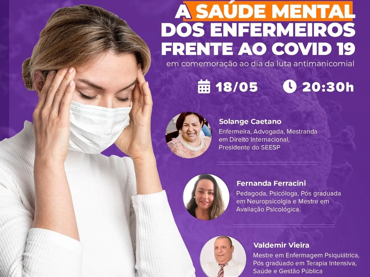 Nesse encontro foi abordada a questão da luta antimanicomial, comemorada no mesmo dia do evento, saúde mental dos enfermeiros e patologias que tem se evidenciado diante da pandemia.