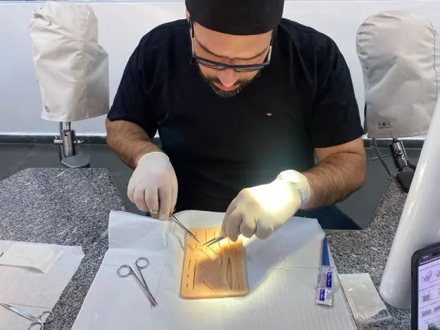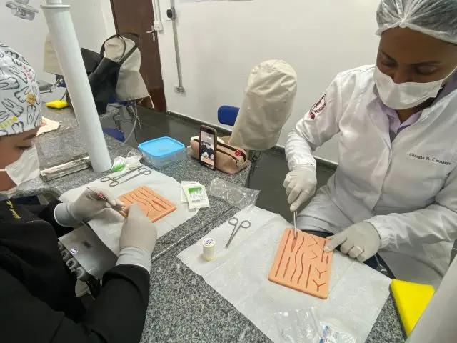 O curso de Odontologia da UNIFACCAMP, por meio da disciplina de Cirurgia Maxilofacial, realizou na última segunda-feira (09) um workshop prático de incisões cirúrgicas e suturas, reunindo alunos e monitores em uma experiência para a formação profissional. Ao todo, 20 alunos participaram da atividade, que foi realizada no formato “hands on” — expressão em inglês que significa “colocar a mão na massa” —, proporcionando aos estudantes a oportunidade de aplicar, na prática, técnicas essenciais para a futura atuação como cirurgiões dentistas.