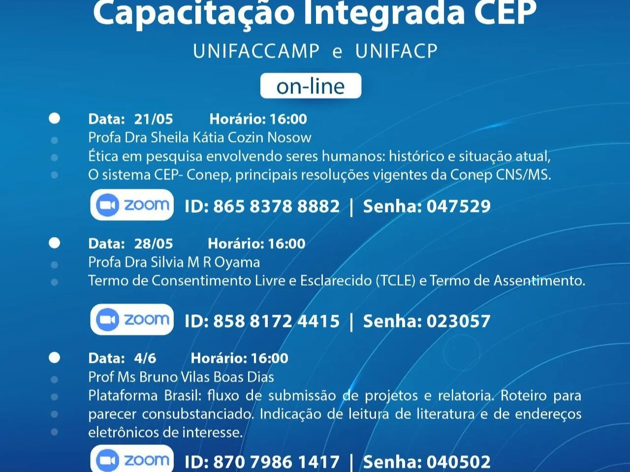 Outros dois encontros ocorreram no dia 28 de maio, com a própria coordenadora Sílvia Oyama abordando o termo de consentimento livre e esclarecido (TCLE) e termo de assentimento, e no dia 4 de junho, com o professor Bruno Villas Boas falando sobre o “Fluxo de submissão de projetos”.