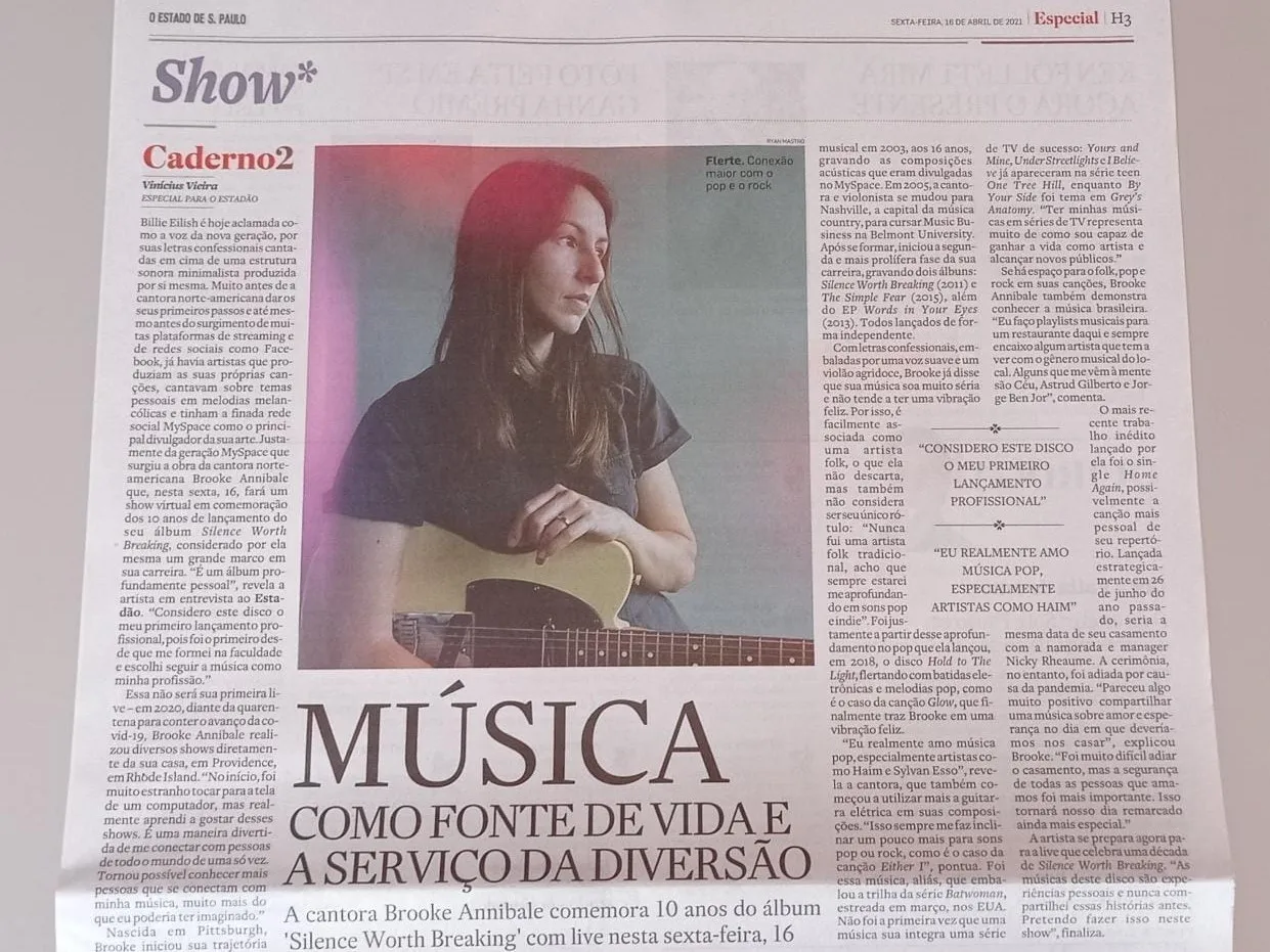 “A matéria foi publicada no mesmo dia que a cantora faria um show virtual em comemoração aos 10 anos de lançamento do seu álbum “Silence Worth Breaking”, e a oportunidade surgiu por intermédio de um amigo da profissão, Wagner Prado, que conhece o editor do Caderno 2 do Estadão, o Ubiratan Brasil”, lembra Vinícius.