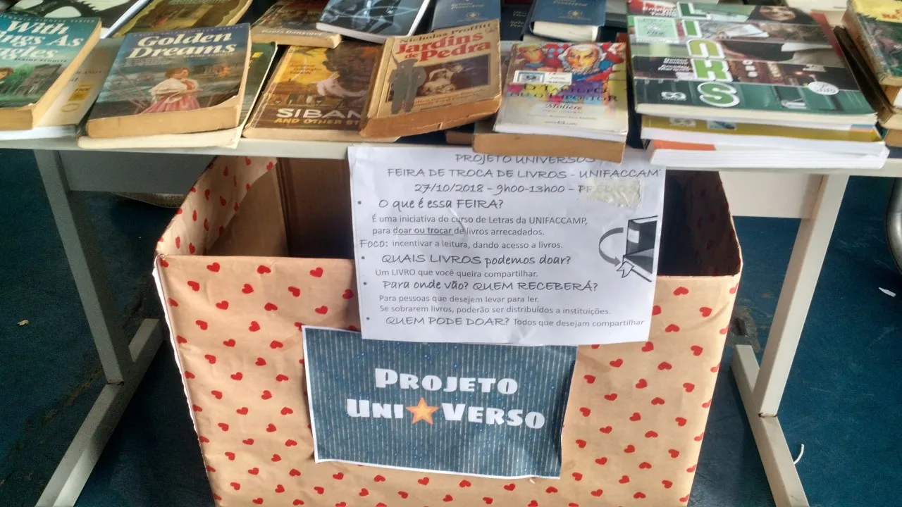 Os alunos do curso de licenciatura em Letras participaram da Feira de Profissões com um projeto promovendo a educação e o conhecimento, o projeto Universos. “Com o projeto ao longo de todo o mês de outubro, foi possível arrecadar livros nos prédios da instituição. Os visitantes puderam também trocar e doar livros durante o evento de sábado também. Agora, os livros serão doados a instituições.”