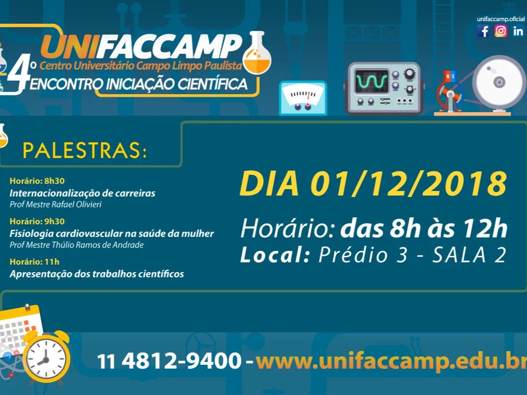 O Centro Universitário Campo Limpo Paulista apresenta o 4º Encontro de Iniciação Científica, desenvolvido pelos alunos de diversos cursos, neste sábado, 1º de dezembro, no prédio 3, sala 2 da …