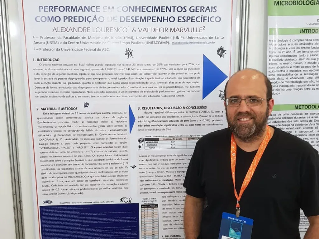 Como uma forma de compartilhar estudos, o professor Alexandre Lourenço apresentou um pôster sobre “performance em conhecimentos gerais como predição de desempenho específico”, nos dias 6 a 9 de outubro, no 30º Congresso Brasileiro de Microbiologia, em Maceió.