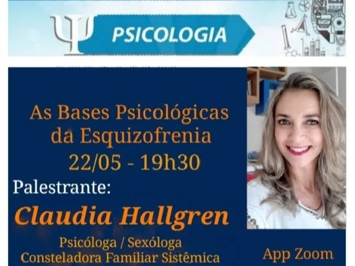 Por meio da plataforma online Zoom, a psicóloga Claudia Hallgren palestrou para algumas turmas do curso de Psicologia e Direito sobre as bases psicológicas da Esquizofrenia, na noite de 22 de maio.