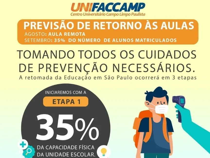 No dia 07 de outubro, será a vez da retomada da educação presencial, com 35% dos discentes matriculados por turma, preservando sempre o distanciamento de 1,5m e podendo haver o revezamento dos estudantes por dia. Neste caso, os demais assistirão a mesma aula remotamente. (datas e números definidos pelo Governo de São Paulo).